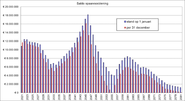Onderstaande grafiek toont het saldo in de spaarvoorziening op 1 januari (inclusief jaardotatie) en 31 december van ieder jaar.