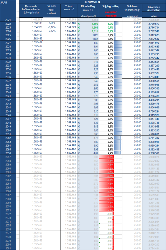 Vaststelling van het WTP 2022-2026 is in 2022. De rioolheffing voor 2022 is daarom (exclusief indexatie) onveranderd en gelijk aan 2021. Ondanks de hoge stand van de voorziening wordt er vanaf 2023 een lichte stijging ingezet waardoor het mogelijk is om vanaf 2027 de heffing gedurende circa 30 jaar met 2,9% per jaar (exclusief indexatie) te laten stijgen om kostendekkend te blijven en geen kapitaallasten te maken.