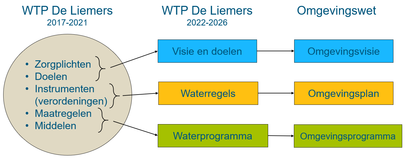 Met de komende invoering van de omgevingswet op 1 jan 2023 legt de gemeente haar strategische kijk op de fysieke leefomgeving vast in een Omgevingsvisie. Hier maakt water onderdeel van uit. Waterregels worden vastgelegd in het omgevingsplan en beleid en maatregelen in het omgevingsprogramma. Dit Watertakenplan biedt input voor de omgevingswet en geeft zo mede richting en kaders voor het ruimtelijk domein. Figuur 1 geeft de samenhang van het Watertakenplan met de instrumenten van de omgevingswet weer.